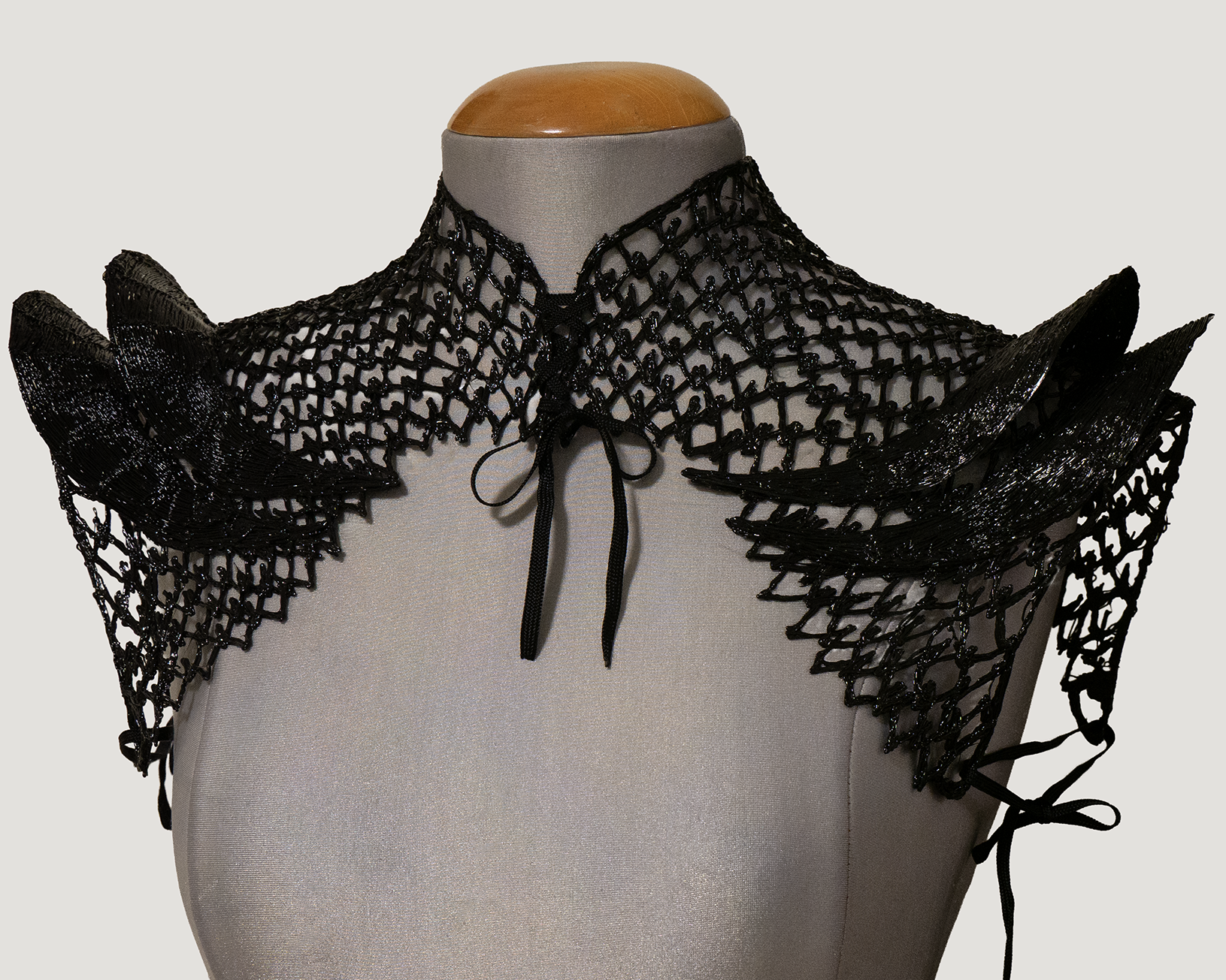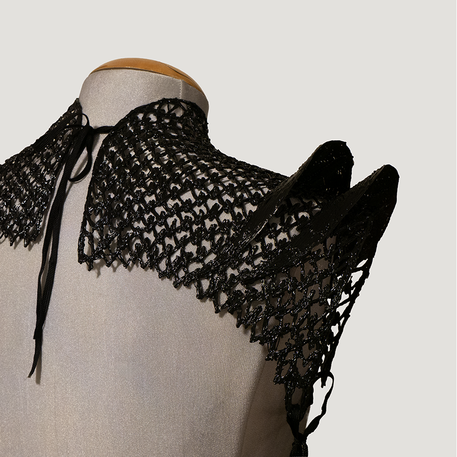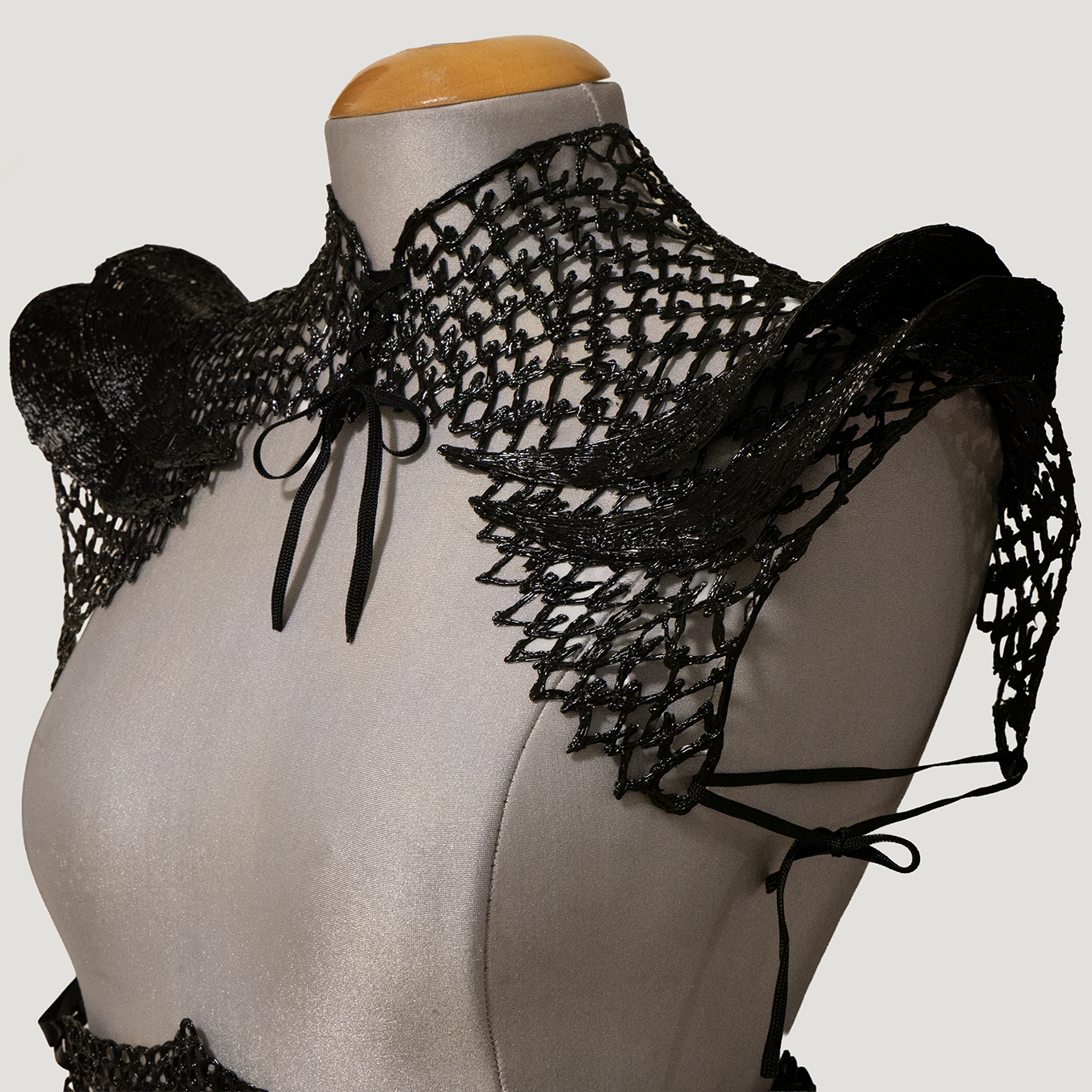 This piece features dimensional layering and intricate construction that catches light beautifully, creating a striking silhouette. Perfect for special occasions, this statement piece transforms a simple dress into a couture-worthy look. The artisanal craftsmanship ensures no two boleros are identical, making this a truly exclusive addition to your wardrobe.